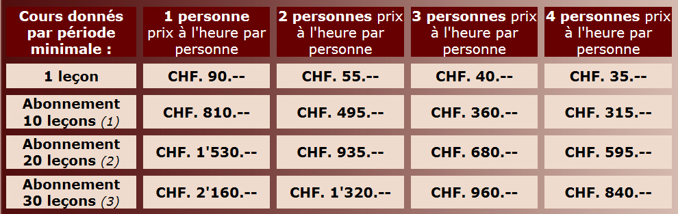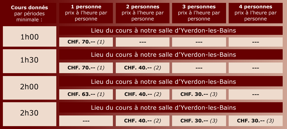 Première heure de cours à CHF. 70.-- rabais par module de 8h00 payable à l’avance CHF. 63.-- de l’heure (10% de rabais). Par période minimale de 2h00 à la fois (à raison d'1x par semaine).