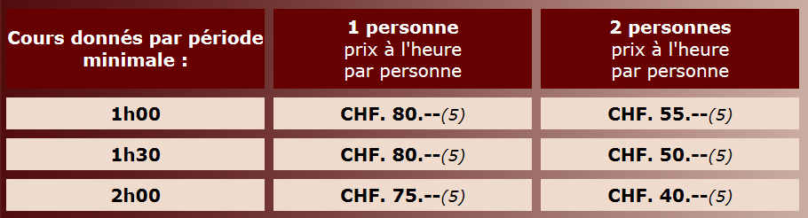 Première heure de cours à CHF. 70.-- rabais par module de 8h00 payable à l’avance CHF. 63.-- de l’heure (10% de rabais). Par période minimale de 2h00 à la fois (à raison d'1x par semaine).